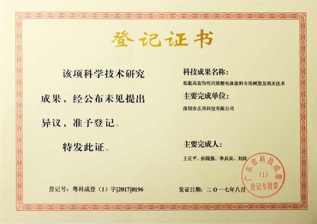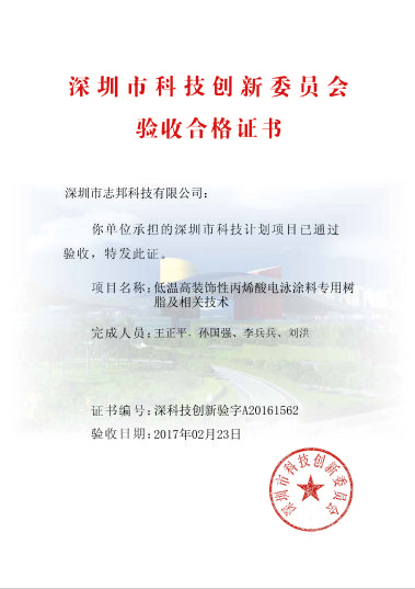 榮獲“國家高新技術(shù)企業(yè)”“深圳市創(chuàng)新性技術(shù)企業(yè)”并獲得深圳市創(chuàng)新委員會低溫電泳漆專用研發(fā)資金